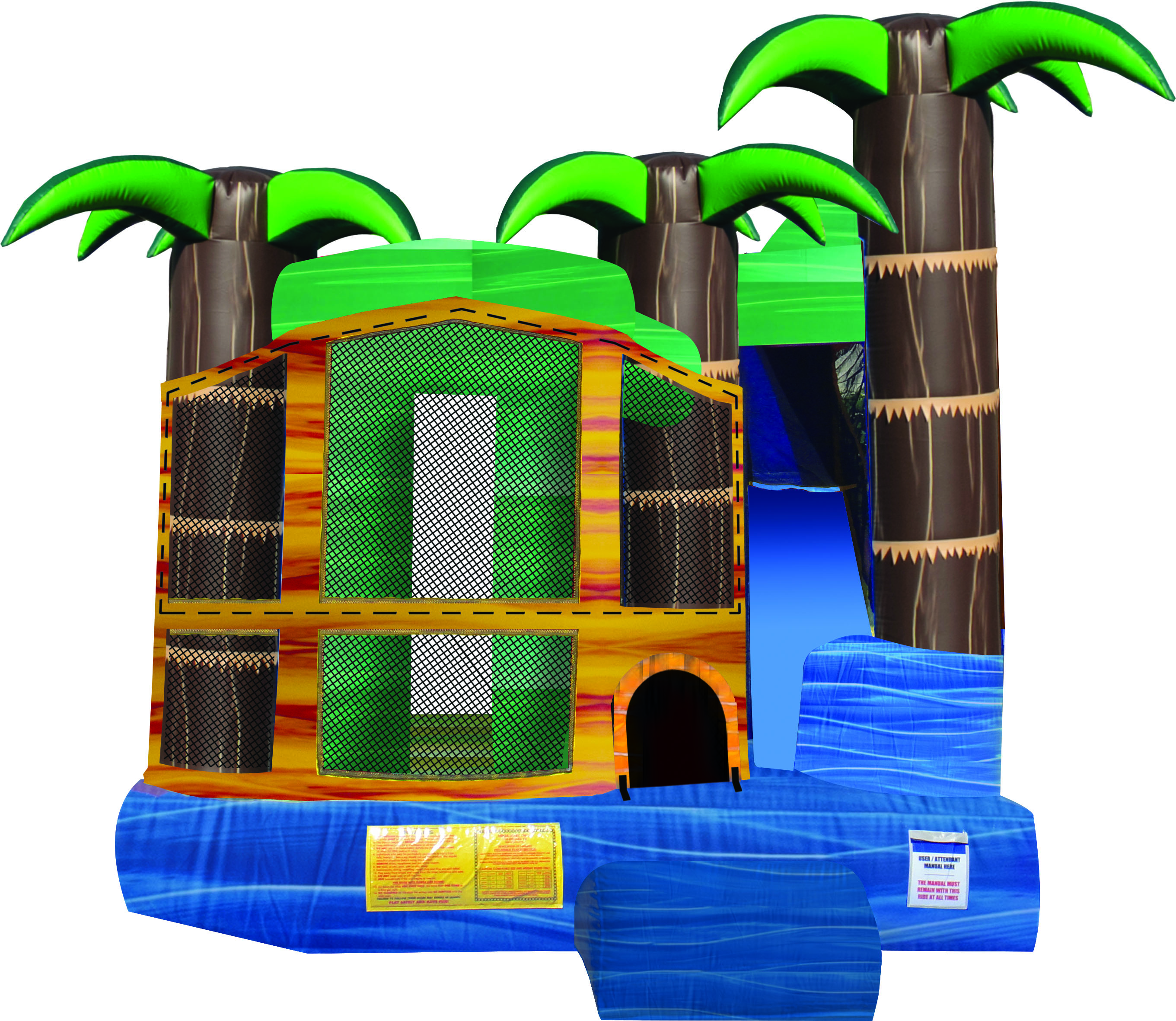 The Backyard combo style bounce house is the ultimate in inflatable jumpers! The large interior jumping area offers a basketball hoop. This bouncy castle has a climb feature and a convenient exit slide for hours of active fun! Parents and spectators are offered a clear view with the 360-degree mesh sides of this moonwalk. The Backyard combo bounce house is made of lite n strong™ fire-resistant vinyl for safety, durability and easy portability. This Backyard bouncy house is sure to make any indoor or outdoor event a great success!