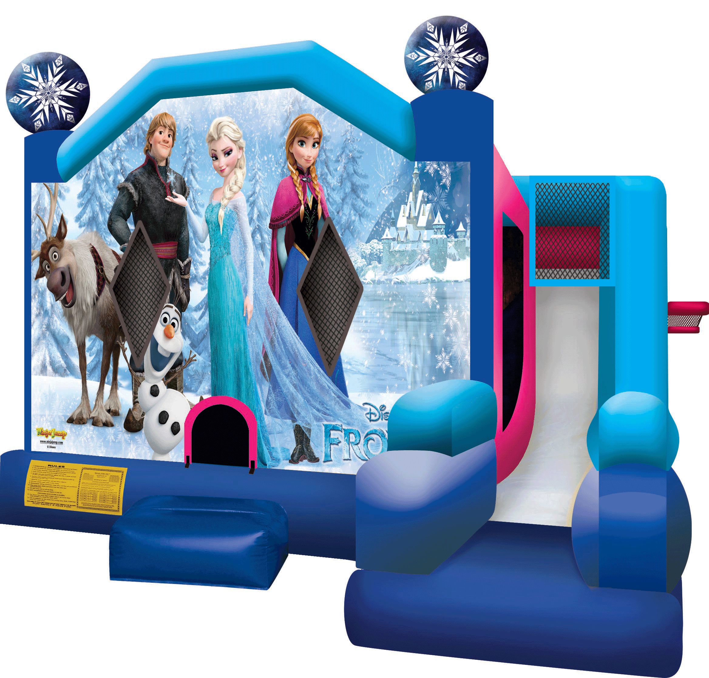 The Frozen Ultra Combo has a large bounce area, maze & pop ups, slide and 2 basketball hoop! Great for a theme party, special event, Summer BBQ and more! Recommended for Ages 3 years to 10 years. Price includes: Delivery, Set up & Tear Down, The inflatable unit, 2 Blowers, extension cord, Tarps, Sandbags or Stakes, and Safety Review!